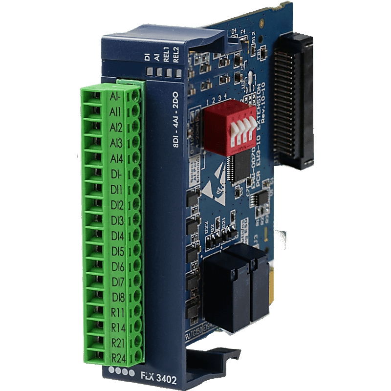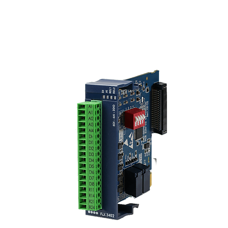 La tarjeta de expansión I/O FLX3401 para el router modular Ewon Flexy es una solución versátil y eficiente para la adquisición y gestión de datos en aplicaciones industriales. Este módulo integra 8 entradas digitales (DI), 4 entradas analógicas (AI) y 2 salidas digitales (DO), permitiendo el monitoreo y control remoto de una amplia gama de dispositivos y sensores.